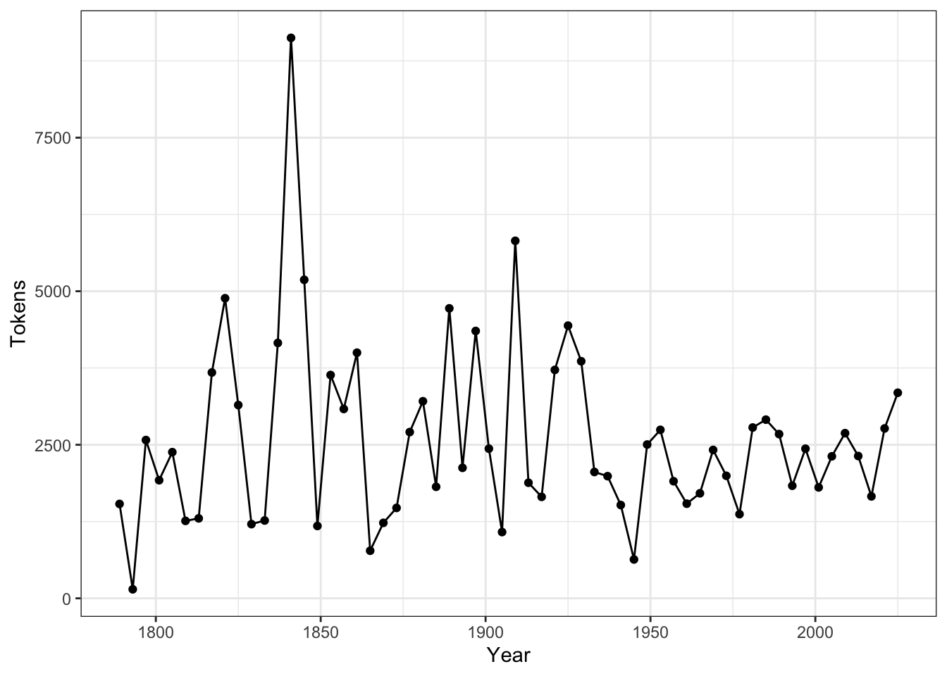 ggplot(aes(x = Year, y = Tokens, group = 1)) +
